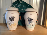 Because of the nature of the materials used, the artistry involved, and the firing process, each urn that is created will be unique, with variations to be expected in size, shape, glaze effects, and design. There may be slight variations in volume. Sometimes I alter the urn shape slightly to enhance the particular pet image or personality.